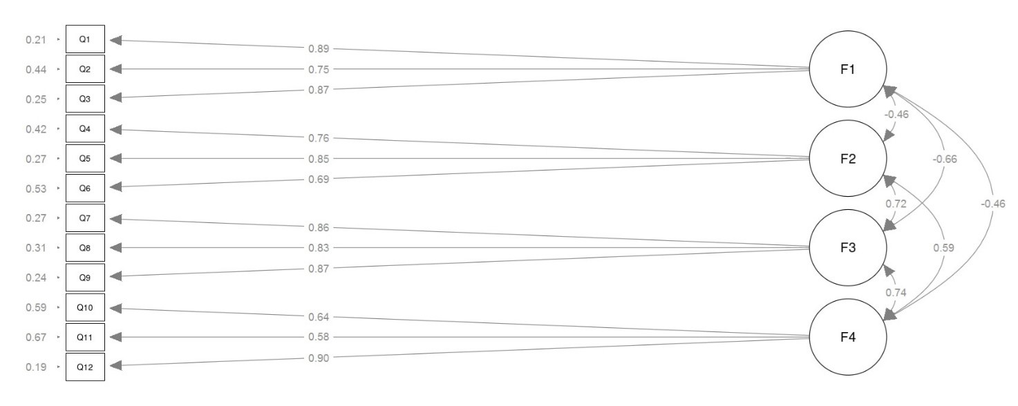 Нами проверялась оригинальная модель опросника методом КФА. Модели КФА строились с помощью пакета Lavaan, версия 0.6-18. Пороговые значения и методология анализа выбирались на основе работы Р. Кляйна (Kline, 2011): CFI > 0,92, TLI > 0,9, RMSEA < 0,08, SRMR < 0,08. Модель продемонстрировала хорошие показатели соответствия исходным данным с точки зрения традиционно принятых критериев. Показатели соответствия модели исходным данным равны χ2(48) = 161 (p < 0,001), CFI = 0,958, TLI = 0,942, RMSEA = 0,0768, SRMR = 0,0492.