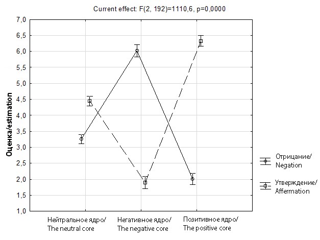 Результаты дисперсионного анализа показали (рис. 1), что при нейтральном ядре отрицание значимо сдвигает эмоциональную реакцию к негативному полюсу (F(1; 34,8) = 128,957, р = 0,000, η2 = 0,573), при негативном ядре отрицание значимо сдвигает эмоциональную реакцию к позитивном полюсу (F (1; 418,7) = 902,512, р = 0,000, η2 = 0,903), а при позитивном — сдвигает к негативному (F (1; 457,5) = 1234,563, р = 0,000, η2 = 0,927).