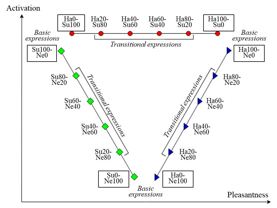 Основная цель данных исследований заключается в выявлении воспринимаемого соотношения эмоциональных экспрессий и реконструкции полного перцептивного пространства, включающего 7 базовых выражений (радость, удивление, страх, отвращение, гнев, печаль, нейтральное лицо) и переходные ряды между ними. В экспериментах используются фотографии из базы видеоизображений естественных переходных эмоциональных лиц — ВЕПЭЛ (Куракова, 2012). ВЕПЭЛ включает в себя 21 переходный ряд между базовыми экспрессиями по 6 изображений в каждом (две базовые и четыре переходные). Величина теоретического различия соседних членов ряда равна 20% и рассчитывается как 1 – r, где r — коэффициент корреляции Пирсона между векторами яркостей отдельных пикселей (Жегалло, 2023). Изображения в таком ряду считаются эквидистантными.