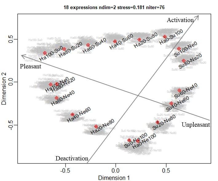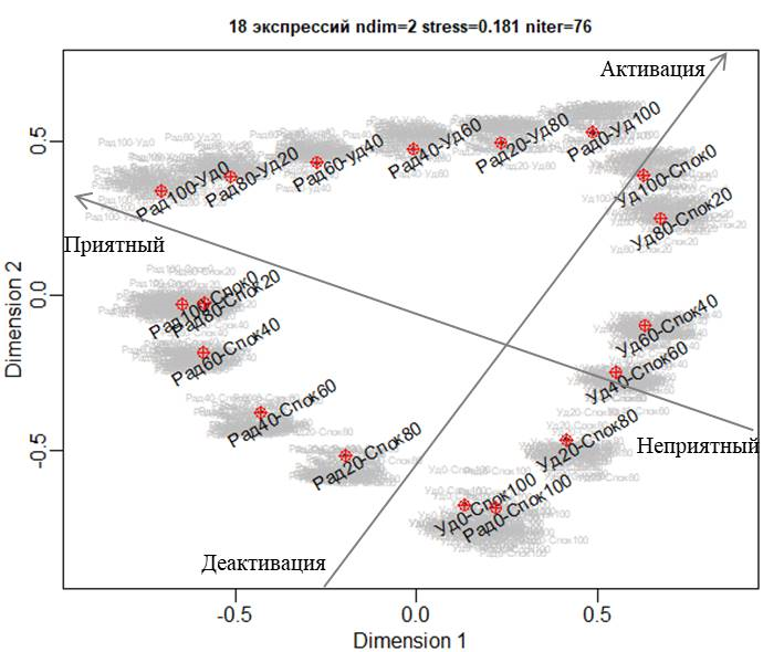 Реконструированное пространство представляет собой треугольник, в котором сильные эмоции находятся ближе к углам, а переходные экспрессии — на гранях. Оси Х и Y могут соответствовать измерениям приятности и активации соответственно. При этом экспрессии Рад100-Спок0 и Уд100-Спок0 располагаются ниже Рад100-Уд0 и Рад0-Уд100 по шкале активации и, вероятно, воспринимаются как часть переходного ряда от спокойствия до сильных эмоций смешанного ряда. Однако показатель соответствия модели stress-1 имеет относительно высокое значение (0,181 при идеальном значении 0). В данном случае это может быть связано как с недостаточным качеством реконструкции, так и с большим объемом выборки и количеством сравниваемых объектов (Mair, Borg, Rusch, 2016).