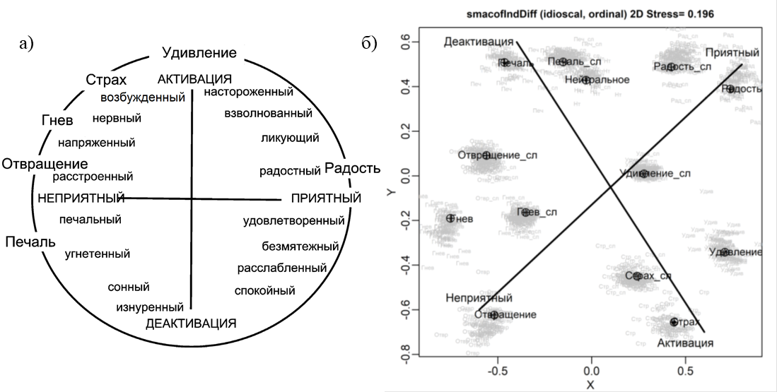 Из-за утомляемости испытуемых сложность создания полной реконструкции состоит в ограниченном объеме стимулов, которые могут быть включены в один эксперимент. В связи с этим сбор данных осуществляется на отдельных наборах стимулов. В первых экспериментах (Жегалло, 2021; Жегалло, Басюл, 2023) на основе прямых оценок сходства было реконструировано пространство 13 экспрессий (6 сильно, 6 слабо выраженных эмоций и нейтрального лица). С позиции нейрокультурного подхода предполагалось, что перцептивное пространство будет описываться тем же количеством измерений, сколько базовых эмоций включено в эксперимент. Однако полученная реконструкция соответствовала двумерной модели Дж. Расселла, в которой на противоположных полюсах оси приятности лежат эмоции радости (приятный) и отвращения (неприятный), а на полюсах оси активации — спокойствие (деактивация) и удивление (активация). Визуализации представлены на рис. 1.