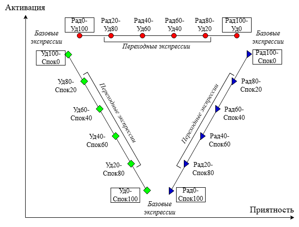 Следующий этап исследований направлен на реконструкцию пространства полных переходных эмоциональных рядов. Для этого выбирается три переходных ряда, которые в общем виде имеют следующую структуру: «базовая экспрессия 1 — переходные экспрессии 1—2 — базовая экспрессия 2 — переходные экспрессии 2—3 — базовая экспрессия 3 — переходные экспрессии 3—1» (т. е. образуют замкнутую фигуру). В настоящем эксперименте проверяется эффективность применения парадигмы прямого сравнения для реконструкции пространства экспрессий, имеющих малую величину различий. Для трех переходных рядов ожидается модель треугольника, в котором сильные эмоции находятся на вершинах, а переходные экспрессии расположены линейно на гранях. На рис. 2 представлена иллюстрация модели переходных рядов «спокойствие — радость — удивление — спокойствие». Поскольку треугольник является двумерной фигурой, то предполагается, что пространство будет описываться двумя измерениями. Учитывая результаты предшествующих исследований, можно полагать, что эти измерения будут определяться как оси приятности (полюса «приятный» — «неприятный») и активации (полюса «активация» — «деактивация») модели Core Affect Дж. Расселла (Russell, Barrett, 1999). Получение результатов, соответствующих выдвинутым гипотезам, будет свидетельствовать о возможности дальнейшего применения методики прямого сравнения для реконструкции полного пространства эмоциональных экспрессий путем сбора информации на отдельных «треугольниках» и их последующей интеграции в единую модель.