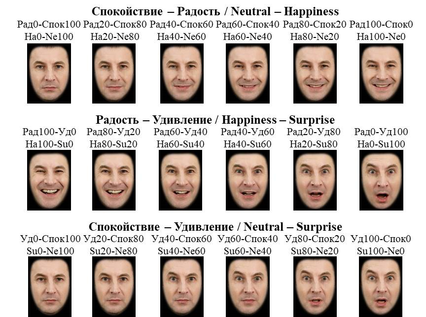 В эксперименте приняли участие 40 человек (13 мужчин и 27 женщин) в возрасте от 17 до 41 года (М = 22,075, SD = 7,1) с нормальным или скорректированным до нормального зрением. Исследование проводилось на ноутбуке с диагональю экрана 15,6 дюйма и разрешением 1366 х 768 пикселей (pix). Программа эксперимента была создана с помощью программного обеспечения PsychoPy v. 2022.2.4 (Peirce, 2007). Для эксперимента были выбраны переходные ряды «спокойствие — радость», «радость — удивление», «спокойствие — удивление» из базы ВЕПЭЛ (рис. 3).