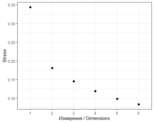 Для выбора размерности пространства был рассчитан показатель соответствия модели stress-1 для 1—6 измерений (рис. 4). На графике осыпи наибольшее повышение качества подгонки наблюдается при переходе от 1 к 2 измерениям, дальнейшее увеличение количества измерений не оказывает столь благоприятного эффекта на модель.