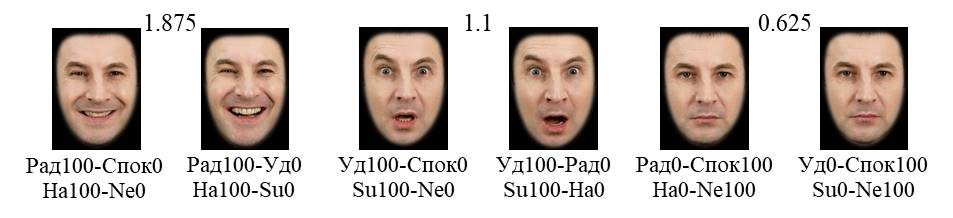Оценки различия для вариаций одной эмоции приведены на рис. 6. Расстояние между экспрессиями сильной радости составляет 1,875, удивления — 1,1, нейтральными лицами — 0,625.