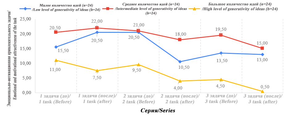 С опорой на рис. 1 и данные в табл. 3 мы можем заключить следующее. Группа низкой генеративности идей (n = 24) демонстрировала нелинейную динамику, которая была выражена в позитивном аффективном сдвиге после первой задачи (Δ₁ = +5,00), резком снижении ЭМП после второй задачи (Δ₂ = -10,00) и стабилизацией на третьем этапе (Δ₃ = -0,50; p > 0,05). Для группы средней генеративности идей (n = 32) были характерны самые высокие исходные ожидания (M = 20,50), прогрессирующая негативная динамика (ΣΔ = -6,00), а также сохранение лидирующих позиций по итоговой удовлетворенности (M = 15). Для группы высокой генеративности идей (n = 16) была обнаружена монотонная редукция исходной мотивации (ЭМП = 11,00 → 9,50 → 4,50), кумулятивный негативный эффект (ΣΔ = -13,00), а также критическое, по сравнению с остальными, снижение ЭМП до 0,50 балла к третьей задаче.
