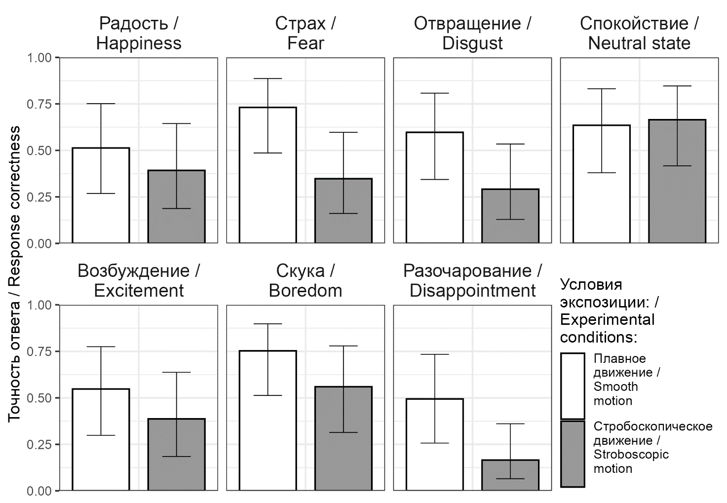 При восприятии динамических точечных паттернов в значительной доле проб наблюдались «ошибочные» ответы, не совпадающие с эмоциональным состоянием, которое выражали натурщики при съемке видеоклипов. Они характеризуют широкое категориальное поле восприятия экспрессий — те состояния, с которыми ядро эмоциональной категории наиболее часто смешивается. Так, при плавной экспозиции экспрессии радости она оценивается как «интерес» (частота оценок 0,18) и реже — как «удивление» (0,1). Страх в небольшом числе случаев распознается как «стыд» (0,08), а скука — как «возбуждение» (0,09). Спокойствие может восприниматься как «расстроенное» состояние (0,16); отвращение — как «интерес» (0,18) и «разочарование» (0,1); возбуждение — как «интерес» (0,23); разочарование — как «беспокойство» (0,35).