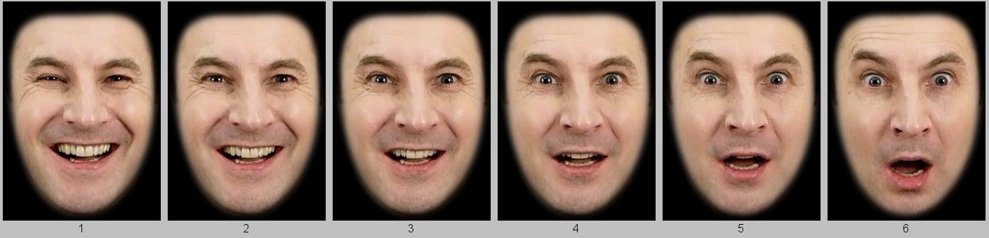 Для проведения исследования использовался ранее разработанный экспериментальный стенд (Жегалло, Басюл, 2019б). Участники исследования располагались в неподвижных креслах КЭ-1 с подголовной опорой. Расстояние до поверхности экрана составляло 60 см. В качестве стимульного материала использовался естественный равномерный переходный ряд «радость — удивление», содержавший 2 опорных изображения и 4 переходных (рис. 1).