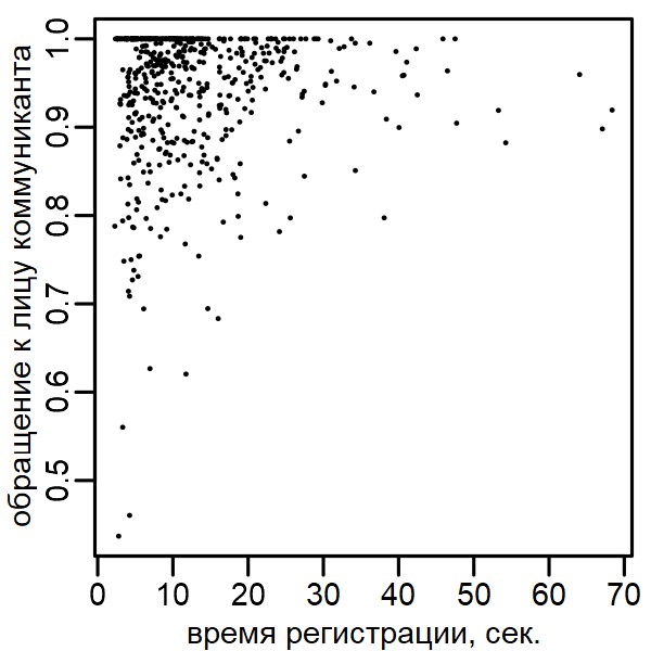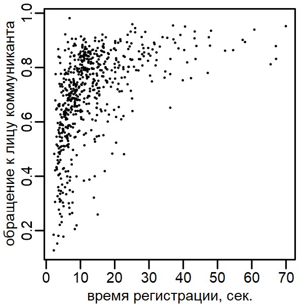 Распределение медианных значений совокупной продолжительности рассматривания следующее: вне зон интереса — 1225 мс; лицо коммуниканта — 7517 мс; кнопка «слева» — 208 мс; кнопка «справа» — 225 мс; кнопка «дальше» — 367 мс. Медианные продолжительности фиксаций составляют: вне зон интереса — 158 мс; лицо коммуниканта — 283 мс; кнопка «слева» — 290 мс; кнопка «справа» — 275 мс; кнопка «дальше» — 271 мс.
