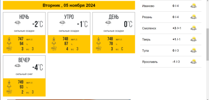 Метеопрогноз. Как речевой жанр, метеопрогноз может быть использован при изучении темы «Мой день» при введении лексических единиц, обозначающих время суток: утро, день, вечер, ночь, утром, днем, вечером, ночью, и при изучении темы «Моя неделя» при введении тематической группы «Дни недели». На продвинутом этапе обучения используются аутентичные видеопрогнозы, например, с сайта «МетеоТВ» (https://meteo-tv.ru/tv/video/).