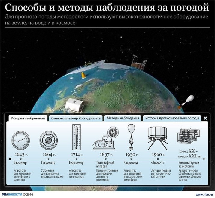 Инфографика. Одним из современных и широко используемых в метеорологии видов визуальной наглядности является инфографика. С.В. Матюшенко и О.О. Князева считают, что когнитивно-визуальный этап наглядности сменился инфографическим: «Инфографика — это эффективный способ подачи информации, при котором данные и знания передаются с помощью графического изображения» (Матюшенко, Князева, 2022, с. 63). Выскажем свое мнение о том, что инфографика остается в рамках когнитивно-визуального этапа, так является одним из способов подачи информации наряду с другими. Например, студентам предлагается составить рассказ о развитии технологий в метеорологии с использованием инфографики в качестве опоры.