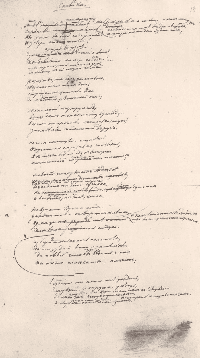 Далее приведем автограф стихотворения «Соседка» (рис. 1), а также подготовленную на основе работы с рукописью (РО ИРЛИ. Ф. 524. оп. 1. № 15. л. 19) транскрипцию автографа (табл. 1), отражающую его правку: