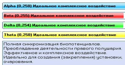 Анализ текста с помощью новой версии компьютерной программы DIATONE, разработанной в лаборатории профессора И.Ю. Черепановой (список используемых компьютерных программ приведен в конце публикации), обнаруживает следующий паттерн мозговой активности (Рис. 1). Текст относится к разряду вербальных моделей идеального комплексного воздействия.