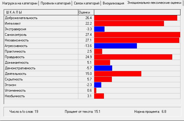 Проведенный с помощью психолингвистической экспертной системы ВААЛ (R) (Шалак, Дымшиц, 2005) контент-анализ текста, включающий среди прочих показателей эмоционально-лексические оценки, позволил оценить эмоциональный фон текста. Модуль компьютерной программы по оценке эмоционального профиля опирается на оценку каждого слова по пятнадцати шкалам, как правило биполярным, но не обязательно симметричным. Каждое слово оценивается по всем пятнадцати шкалам. Эмоционально-лексические оценки определяются через расчет средних величин по каждой из шкал. Если оценка положительная, то строка гистограммы окрашена в красный цвет, если отрицательная – синий. Внизу приведены число эмоционально-оценочных слов (в данном тексте – 19), процент таких слов от всех слов анализируемого текста (15,1%), норма процента эмоционально-оценочных слов в русском языке (6,8%). Анализируемый текст молитвы высоко эмоционален, характеризуется высокими показателями доброжелательности, самоконтроля, независимости, правдивости и отсутствием показателей агрессивности, эгоизма, демонстративности.