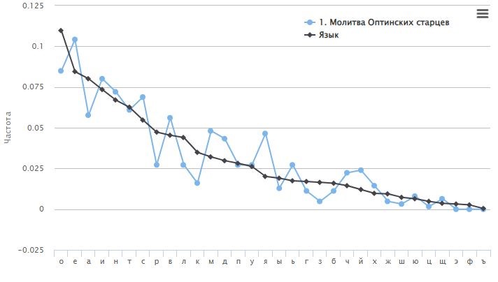 Рис. 4. Показатели частотности букв в тексте – Молитва Оптинских Старцев и в языке