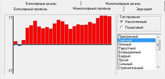 Заслуживает внимания оценка текста через шкалу признаков. Были использованы две разных компьютерных программы для оценки значимых признаков текста (программа ВААЛ, 2005; программа ДИАТОН (СЛОВОДЕЛ), 2008). Получены практически идентичные результаты. На Рис. 5 представлена накопленная гистограмма, которая основана на пошаговом анализе 25 фрагментов текста, структурированных таким образом, что каждый следующий за первым столбик гистограммы является совокупностью предшествующих оценок. Так создается накопленная оценка. Признак текста «Светлый» достигает показателя + 17, усреднённый показатель равен +15.1.