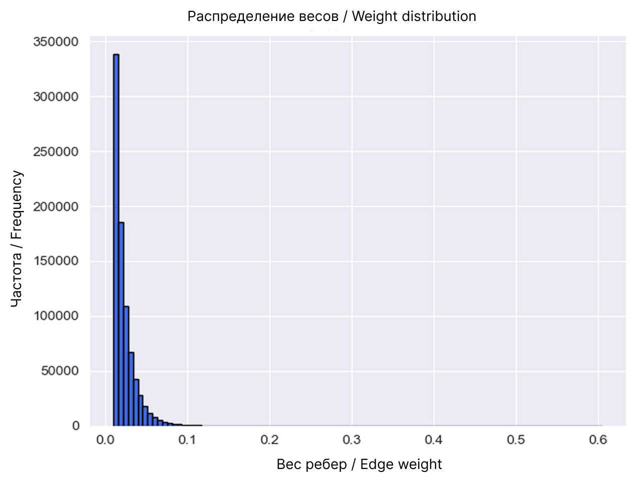 Модулярность исследуемой сети составляет 0.53, что свидетельствует о наличии выраженной кластерной структуры. В сети 942 узла и 10648 рёбер. Средняя степень узлов равна 22.607, следовательно, каждое из маркет-сообществ имеет пересекающуюся аудиторию с более чем 22 другими. Средняя взвешенная степень составляет 1.957. Плотность сети, равная 0.024, говорит о её разреженности, поскольку из всех возможных связей реализована лишь малая их часть. Сеть характеризуется высокой степенью кластеризации: коэффициент кластеризации равен 0.436, количество треугольников в сети достигает 95398, что указывает на тенденцию к триадическому замыканию, типичному для социальных сетей с сильными внутренними связями. Средняя длина пути составляет 3.722, что свидетельствует о высокой связности сети, несмотря на ее разреженность.