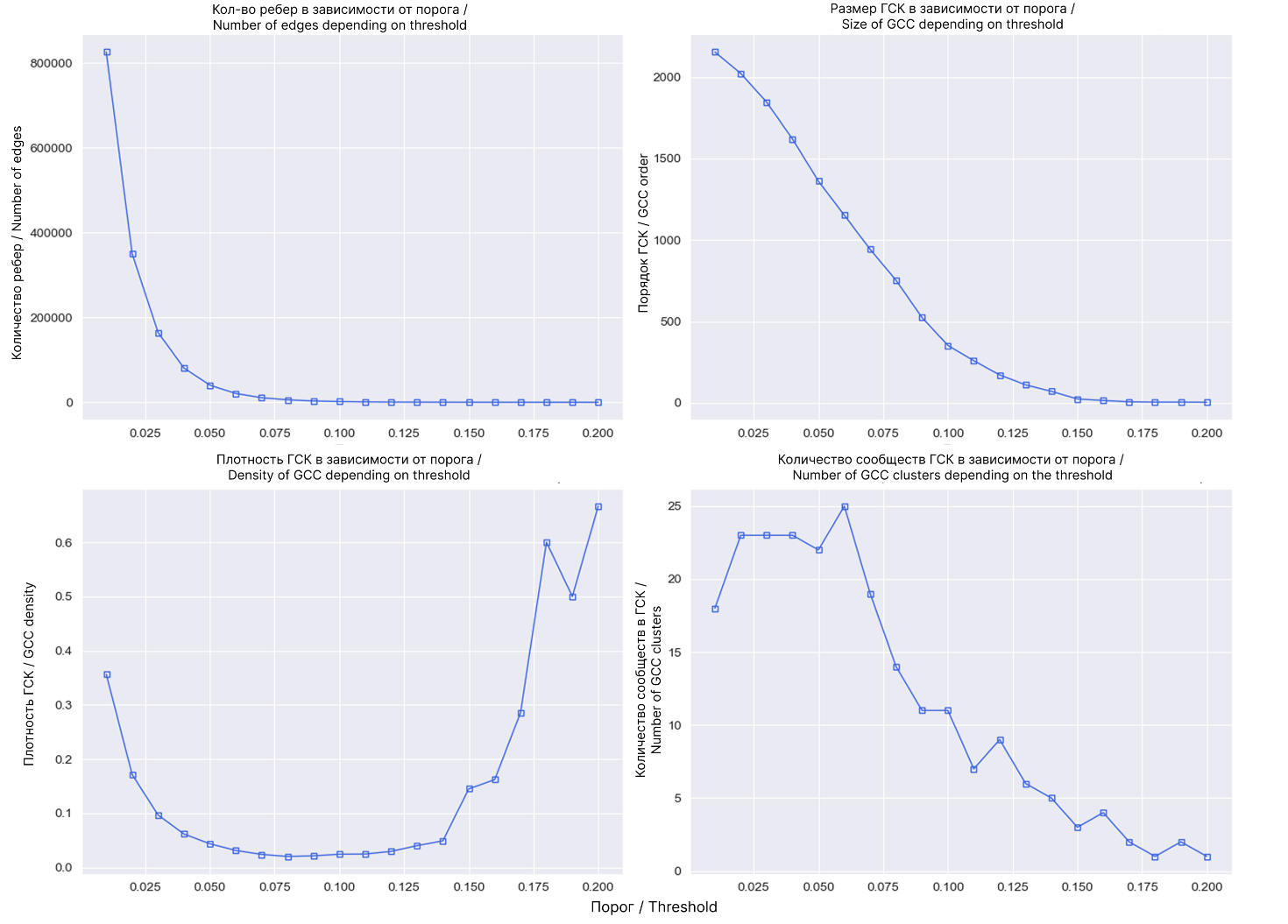 Limitations. The research considers communities that provide data on subscribers, however, there are communities in which subscribers are hidden - such communities are not taken into account in the network, which can somewhat distort the real structure of the network. When filtering edges, the simplest heuristics based on the connectivity of a giant connected component were used, in the future, more complex methods can be used (for example, a disparity filter).
