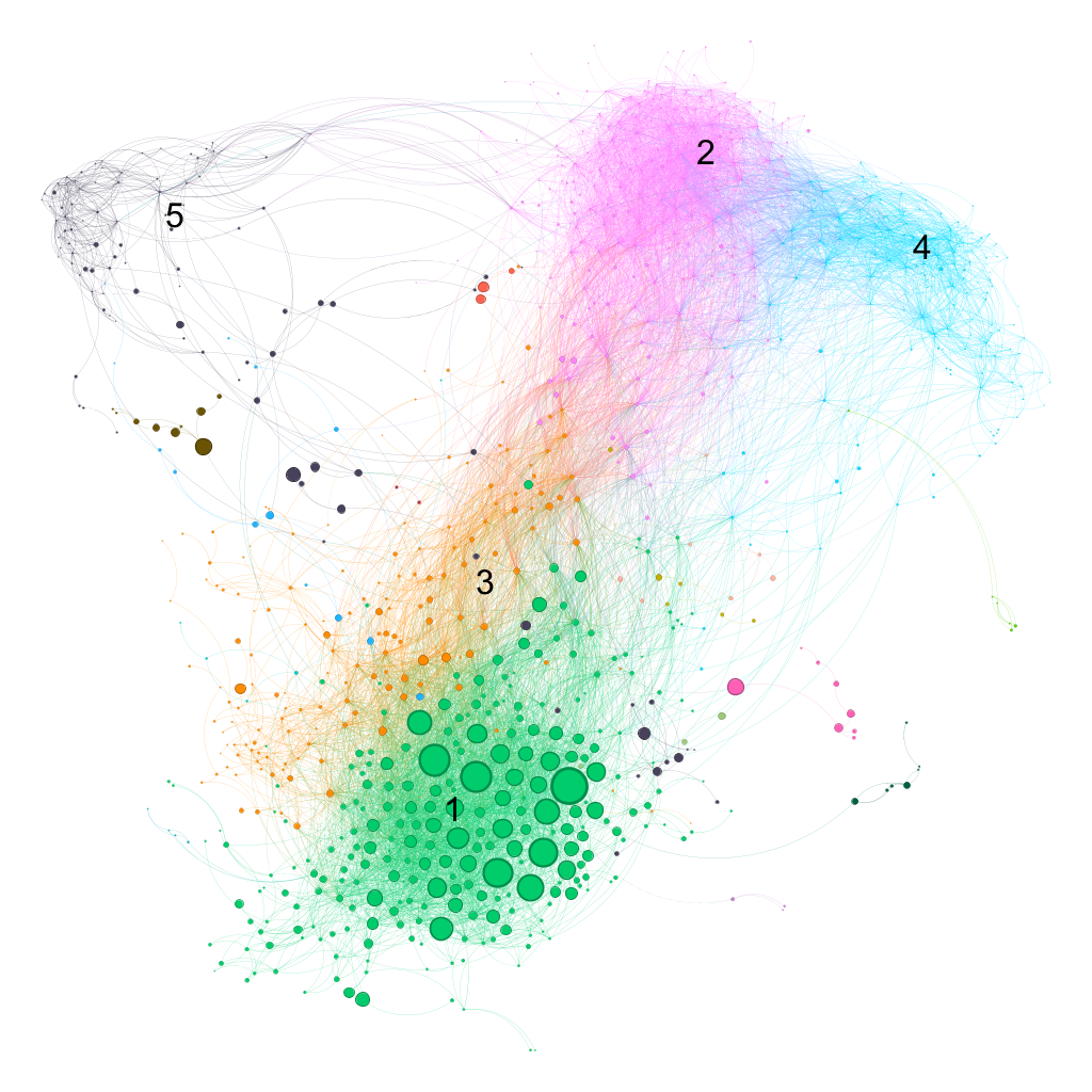 Для обнаружения сообществ нами использовался лувенский метод. Меры центральности рассчитывались с использованием библиотеки NetworkX и языка программирования Python (версия 3.8). Визуализация сети и распределения мер центральности проводились с помощью matplotlib, seaborn и средств визуализации с открытым исходным кодом Gephi.