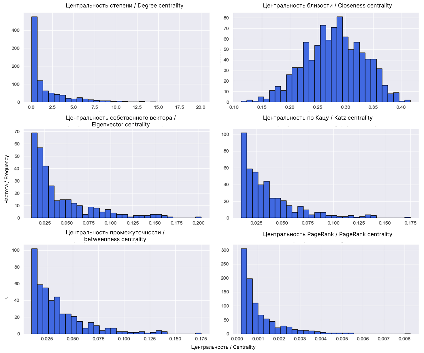 На рис. 4 представлены распределения значений центральности степени, собственного вектора, центральности по Кацу, промежуточности, близости и PageRank.