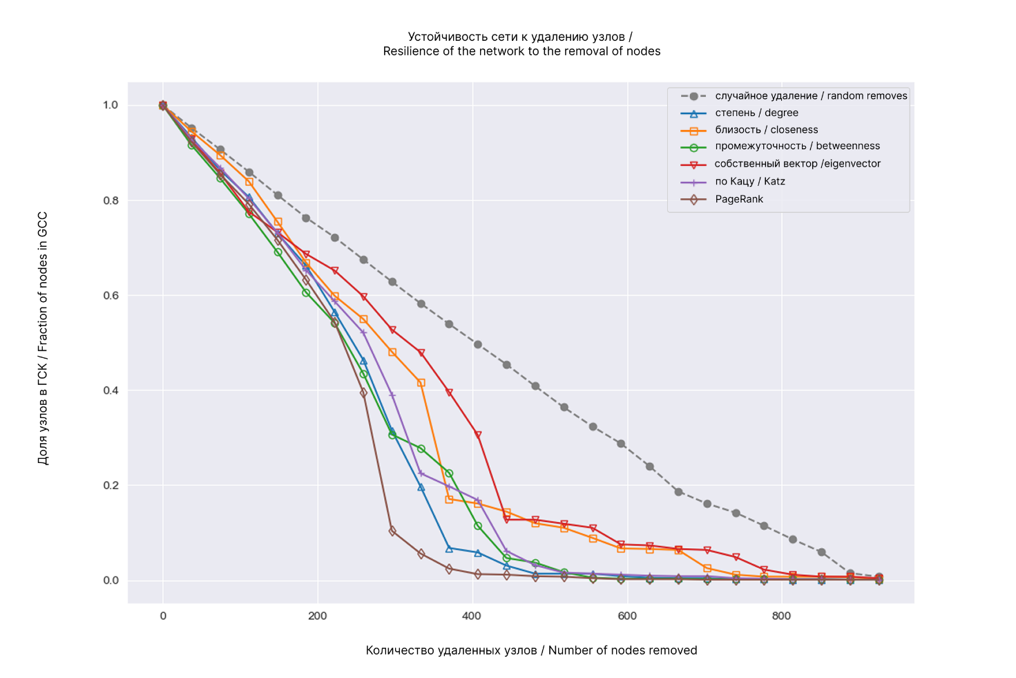 Устойчивость сети маркет-сообществ тесно связана с выбором стратегии удаления узлов. Наиболее критичными для её структуры являются более важные по PageRank узлы. Эти узлы, вероятно, играют ключевую роль в распространении информации через сеть, а их удаление значительно снижает её функциональность.