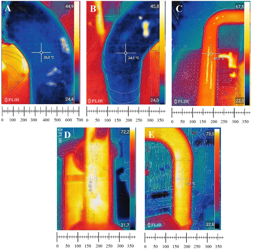 Fig. 1. Thermograms of cooling system pipes. A - pipes supplying sea water to the pumps; B - pipes supplying water to the gearbox; C - pipes supplying oil to the heat exchanger; D - pipes supplying and discharging fresh water from the engine; E - pipes supplying fresh water to the heat exchanger