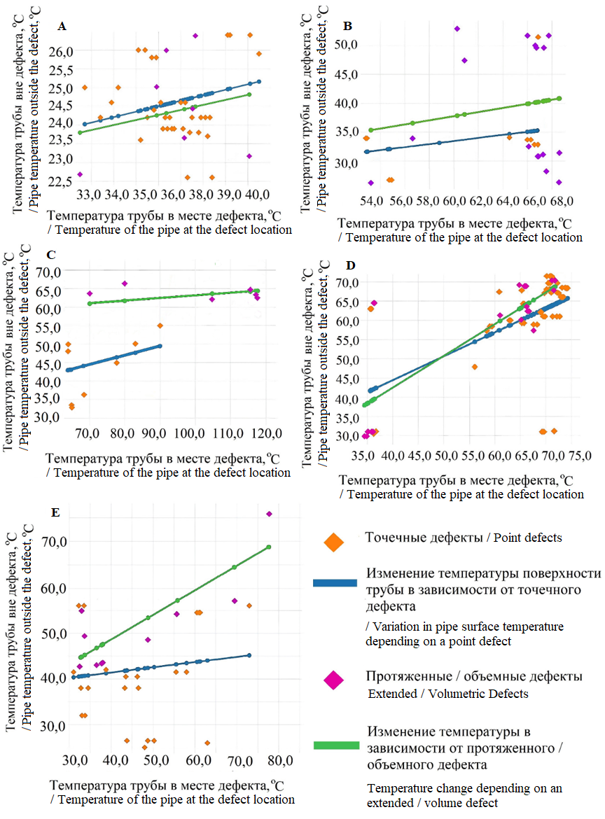 Fig. 2. Regression analysis of the dependence of the change in the average temperature of the intact pipe wall on the temperature of defects of different types (point or extended / volumetric). A - pipes for supplying sea water to the pumps; B - pipes for supplying water to the gearbox; C - pipes for supplying oil to the heat exchanger; D - pipes for supplying and discharging fresh water from the engine; E - pipes for supplying fresh water to the heat exchanger.