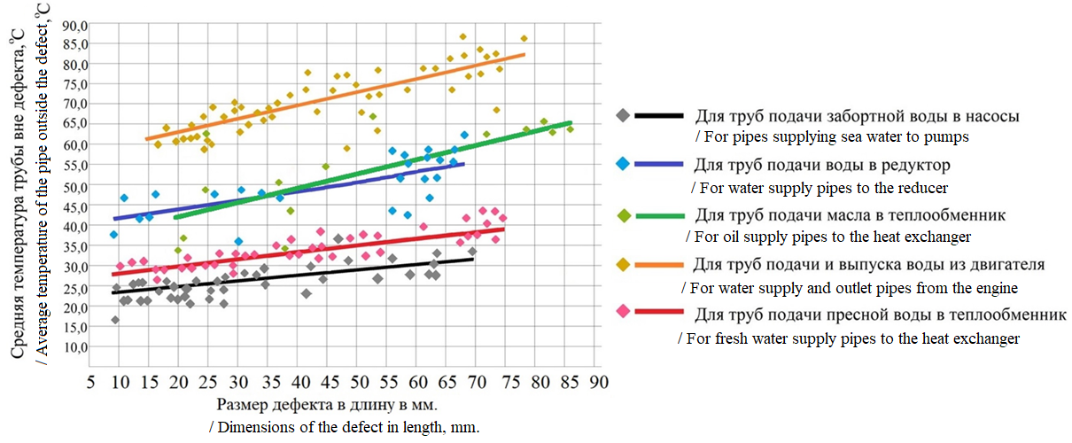 Так в трубах подачи воды в редуктор, трубах подачи и выпуска пресной воды из двигателя, трубах подачи пресной воды в теплообменник скорость прироста температуры неповрежденной поверхности от протяженных и объемных дефектов выше, чем от точечных. Это выражено в более крутом наклоне прямой (Рисунок 2 b, d, e).