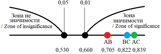 По специальной таблице (Essam, El, Ali, 2022) найдем критические значения коэффициента корреляции по коэффициенту Пирсона для уровней значимости р = 0,05 и р = 0,01, при k =12.