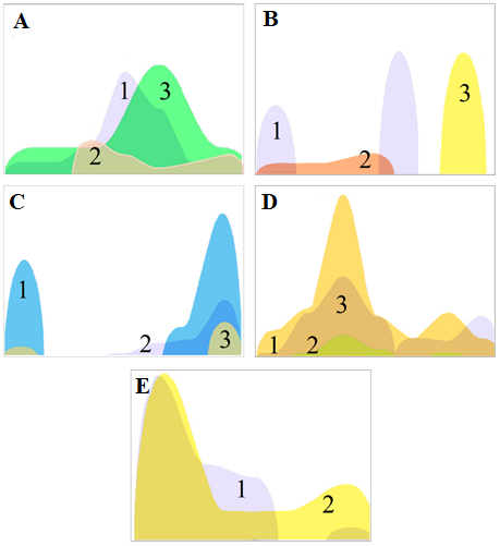Рис. 5. Кластеризация дефектов по температуре поверхности. A - трубы подачи забортной воды в насосы; B - трубы подачи воды в редуктор; C -трубы подачи масла в теплообменник; D- трубы подачи и выпуска пресной воды из двигателя; E - трубы подачи пресной воды в теплообменник. 1 – кластеры точечных дефектов, 2- кластеры протяженных дефектов, 3 – Кластеры объемных дефектов.