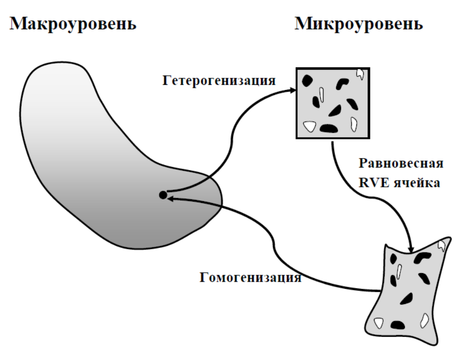 При прямом моделировании КМ на микромасштабных уровнях определить свойства КМ представляется возможным только для небольших областей в силу математической и вычислительной сложности таких моделей. Поэтому практически в каждой работе стоит задача гомогенизации, т.е. перехода от структурно-неоднородной среды к эффективной с эквивалентными осредненными упруго-прочностными свойствами.
