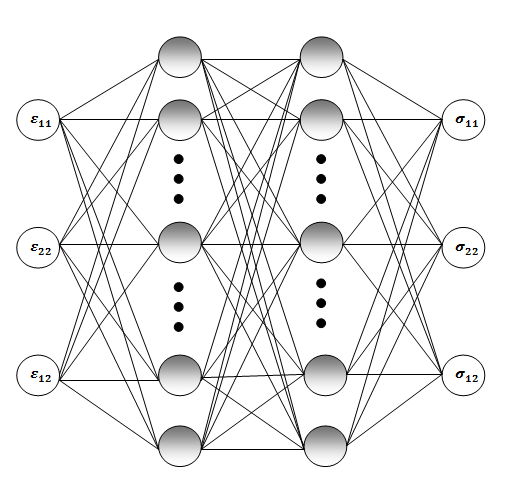 Fig. 2. Establishing the relationship between strain and stress tensors using a neural network (hidden neurons are highlighted in gray) (Xin, 2020)