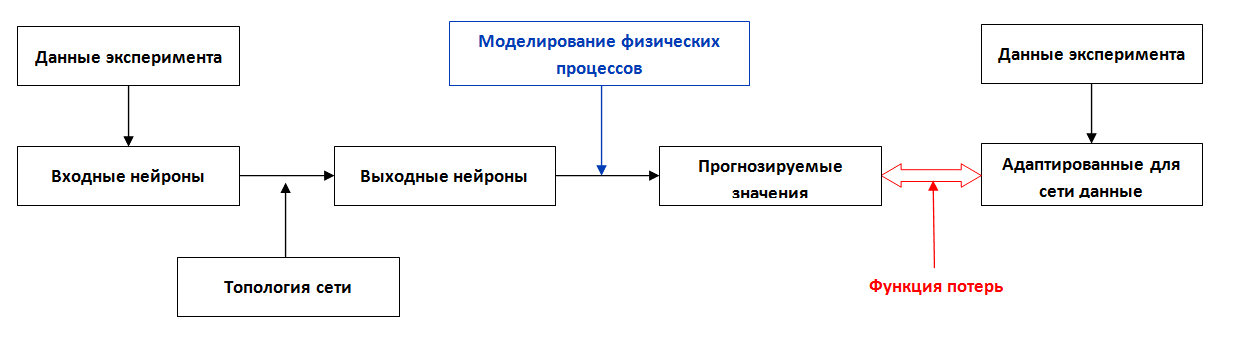 Для обучения нейронной сети необходимо использовать данные о напряжениях, полученные из эксперимента, однако для трехмерных объектов измерение величин напряжений невозможно, также как и их вычисление из-за неизвестности функции зависимости деформаций от нагрузок для КМ. На рисунке 4 показана иная схема обучения нейронной сети: для вычисления данных, которые могут быть получены из натурного эксперимента, используется математическая модель физических процессов, позволяющая на основе данных выходного слоя нейронной сети, рассчитать значения параметров для построения функции ошибки. Основное преимущество данного подхода состоит в том, что на входные и выходные данные нейронной сети не накладываются требования измеримости величин в эксперименте.