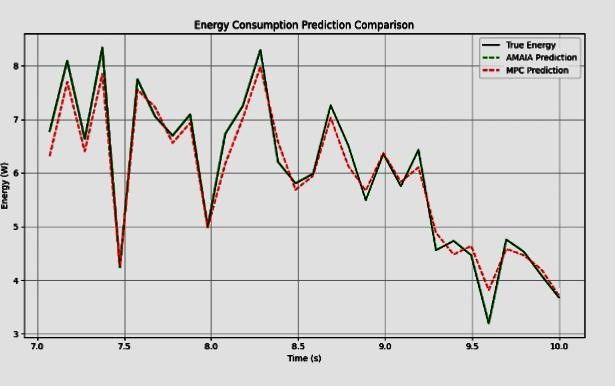 Результаты, показанные на рисунке 1, показывают явный разрыв в эффективности прогнозирования между двумя алгоритмами, особенно бросается в глаза поразительное совпадение траектории прогнозов AMAIA и черной линии, отображающей фактическое потребление энергии. Это точное соответствие указывает на исключительную способность AMAIA отслеживать динамические изменения в потреблении энергии и реагировать на них с высокой эффективностью. точность, отражающая глубокое понимание поведения встроенной системы в различных условиях эксплуатации, и наоборот, производительность алгоритма MPC демонстрирует заметное и систематическое отклонение от фактического уровня энергопотребления, этот недостаток в точности прогнозирования в первую очередь объясняется тем, что MPC полагается на заранее определенные и фиксированные математические модели, которым по своей природе не хватает гибкости и способности быстро адаптироваться к внезапным временным изменениям или неожиданные динамические условия эксплуатации, которые часто характерны для реальных сценариев вождения, приводят к тому, что MPC не может точно отразить сложности и мгновенные изменения в потреблении энергии.
