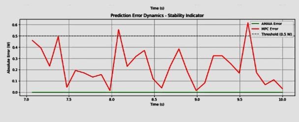 Время, необходимое для того, чтобы ошибка упала ниже порогового значения, имеет решающее значение для оценки времени отклика каждой системы. Для AMAIA время отклика отмечается вертикальной зеленой линией, в то время как для MPC время отклика указывается красной вертикальной линией. Эти линии обозначают конкретные случаи времени, когда ошибка предсказания каждой системы впервые падает ниже 0,5 Вт. На рисунке также подчеркиваются различия в динамике ошибок обеих систем,AMAIA, как адаптивной обучающейся система может демонстрировать более быструю и точную сходимость к низким уровням ошибок, в то время как MPC, более традиционная модель, может потребоваться больше времени для достижения той же точности, что отражено различиями во времени их соответствующих времен отклика. Общая тенденция, наблюдаемая на этом графике, дает четкое представление о стабильности обеих моделей прогнозирования с течением времени. Чем быстрее ошибка системы стабилизируется ниже порогового значения, тем эффективнее она адаптируется к изменениям в окружающей среде, таким как колебания нагрузок на встроенной системе. По сути, этот рисунок иллюстрирует прогностическую способность обеих систем и подчеркивает потенциальные преимущества AMAIA с точки зрения более быстрой адаптации и более точных энергетических прогнозов по сравнению с более статичной и менее адаптивной системой MPC.