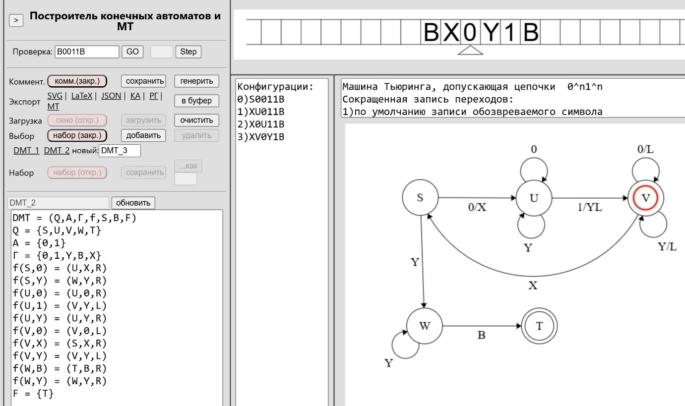 - генерация по диаграммам формальных определений КА, МР-автомата, МТ, регулярных грамматик с проверкой корректности диаграмм;