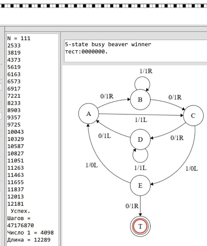 Машина BB(5) останавливается через 47176870 шагов, и это можно промоделировать в программе. На рисунке для BB(5) показано заключительное состояние. В окне конфигураций через каждые 2 миллиона шагов указывается длина текущей цепочки, на ленте – часть последней цепочки длиной 111.