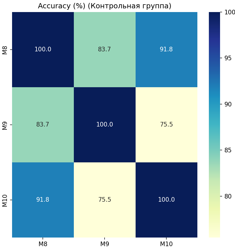 Далее проводилось попарное сравнение матриц переходов внутри групп: экспериментально и контрольной. Затем результаты сравнения усреднялись внутри групп и сравнивались.