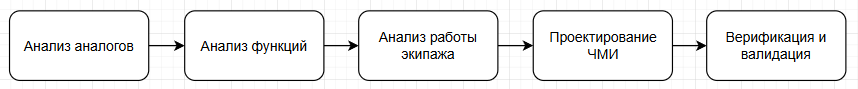Общий порядок разработки человеко-машинных интерфейсов (рис. 2) представлен в (Анохин, Назаренко, 2010, Adelstein at al, 2006), он включает в себя анализ аналогов и требований технического задания, функциональное проектирование, анализ работы экипажа, проектирование интерфейса и последующие этапы верификации и валидации.