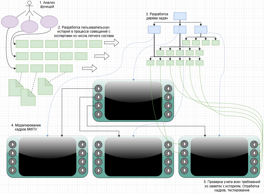 Процесс отработки кадров заключается в том, что каждый из экспертов проходит все тестовые сценарии на имитаторе МФПУ. Другие эксперты при этом могут быть независимыми наблюдателями и фиксировать в блокнотах возникающие у оператора трудности.
