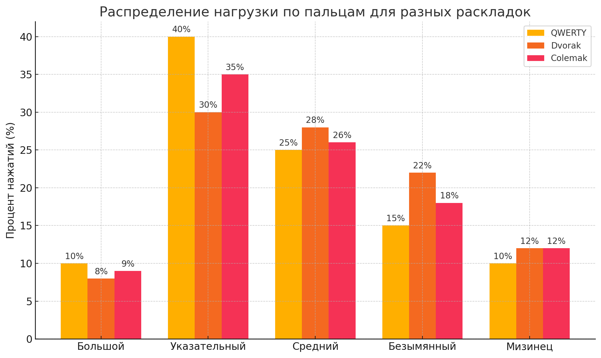 Классическим примером является QWERTY — компоновка, разработанная К. Шоулзом в 1870-х годах для печатных машин. Буквы в ней намеренно разнесены для предотвращения заклинивания рычагов. Эта раскладка стала промышленным стандартом, несмотря на свою эргономическую неэффективность: символы высокой частоты (например, «E» в английском, составляющий около 12.7% всех символов) вынесены в неудобные позиции, отсутствует равномерное распределение нагрузки по рукам, последовательности часто приходится вводить одной рукой или одним пальцем подряд. По данным MacKenzie и Zhang (1999), в QWERTY примерно 30% всех нажатий приходится на левую руку, а 70% — на правую, что приводит к дисбалансу и увеличению утомляемости. Dvorak (1936) ориентирован на размещение гласных и частотных согласных на домашнем ряду, обеспечивая до 70% ударов без перемещения пальцев, что снижает физическую нагрузку и повышает скорость набора (Norman, 2001). Colemak (2006) — компромиссный вариант с сохранением горячих клавиш QWERTY и уменьшением среднего перемещения пальцев на 30%, упрощая адаптацию.