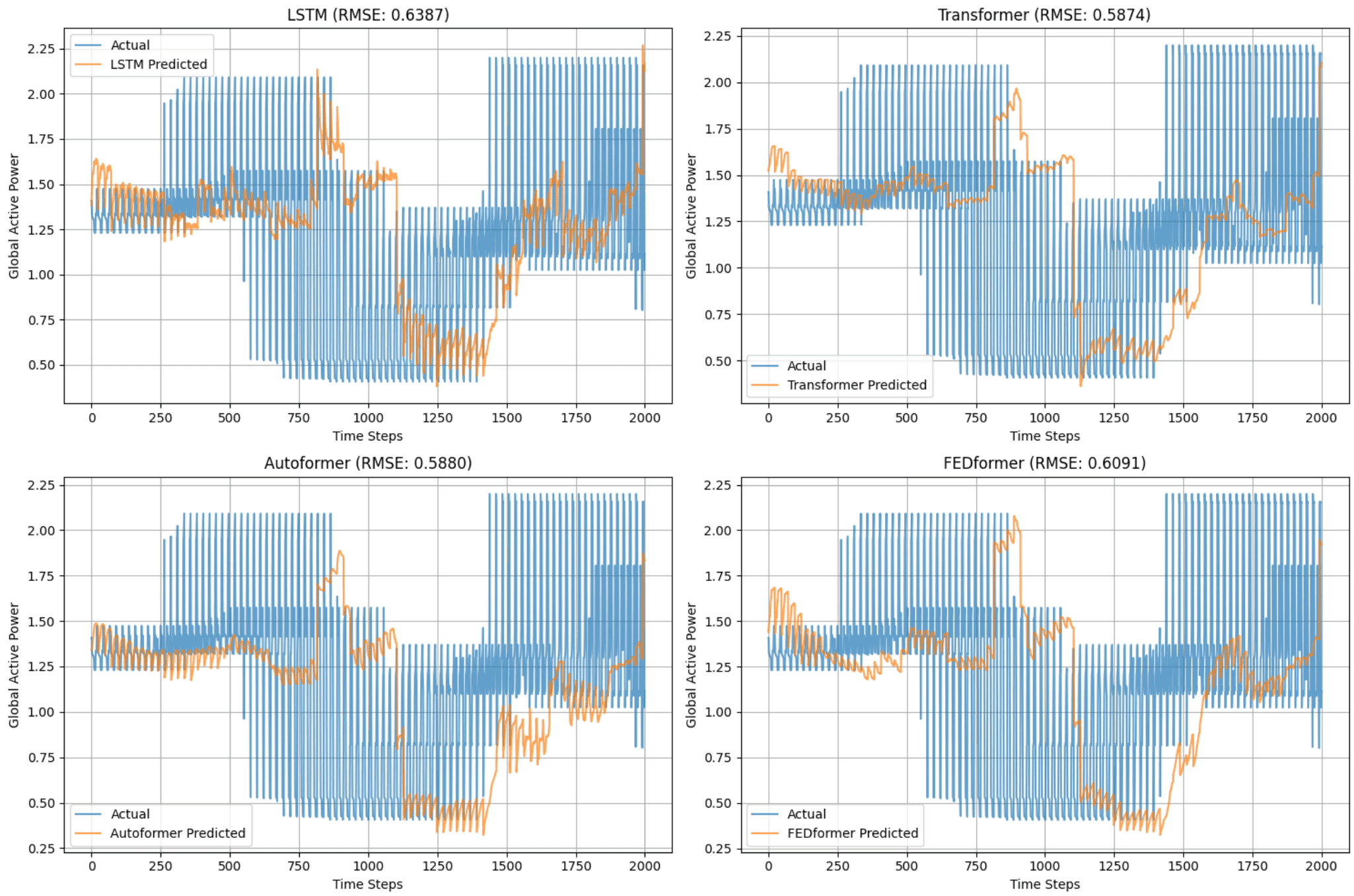 LSTM демонстрирует систематические отклонения в областях резких скачков мощности, что согласуется с теоретическим ограничением рекуррентных сетей при обработке долгосрочных зависимостей. Трансформер наиболее точно отслеживает динамику пиков и спадов, подтверждая гипотезу о преимуществе механизма внимания для захвата глобальных паттернов. Autoformer и FEDformer показывают схожие результаты, но с незначительным ухушением точности из-за избыточной сложности декомпозиции и частотного анализа для данного датасета.