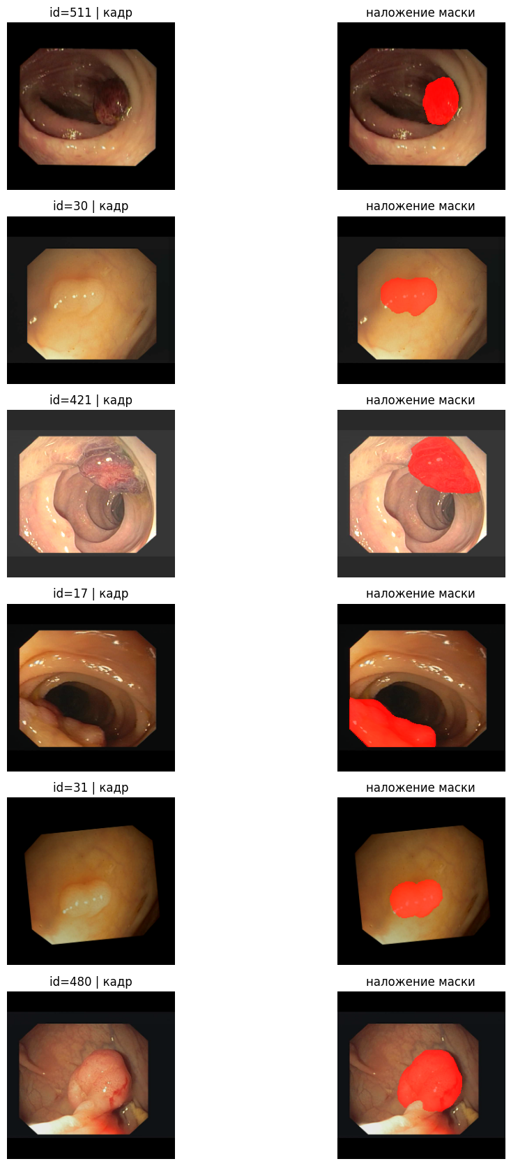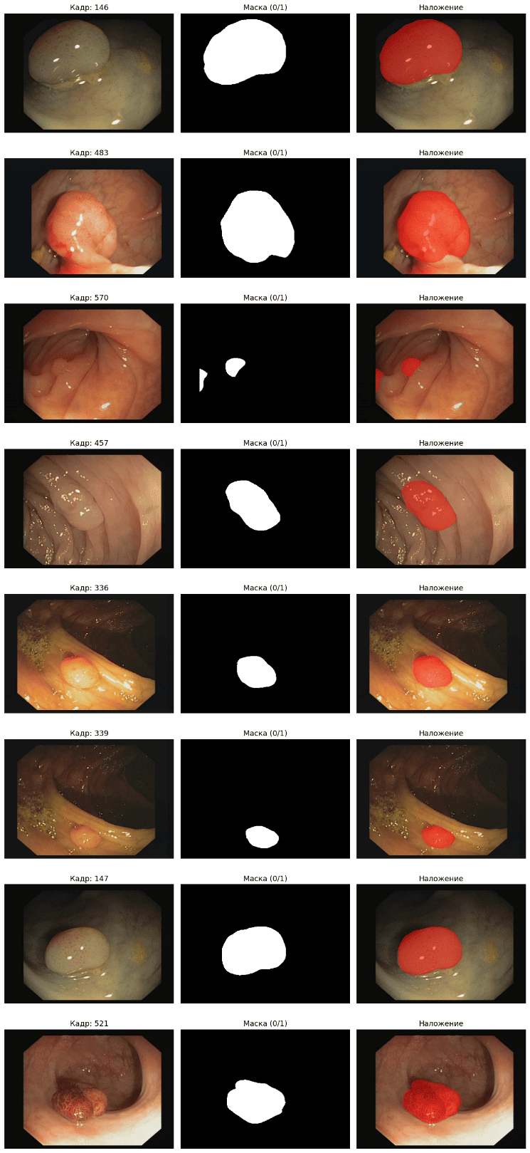 Суммарный объем 612 кадров получается как сумма трех частей и совпадает с внутренней индексацией конвейера. Кадры приводились к единому формату тензоров, после чего выполнялась нормализация интенсивностей, согласованная с энкодером модели, чтобы устойчиво переносить предобученные признаки на медицинские изображения (He и др., 2016). Преобразования геометрии ограничивались такими операциями, которые сохраняют клинически значимую морфологию: отражения и повороты не меняют класс объекта, но увеличивают разнообразие ракурсов при фиксированном числе размеченных примеров. Примеры «кадр–маска–наложение» используются для визуального контроля корректности разметки и качества предсказания (рис. 1).