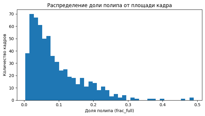 Распределение доли полипа относительно площади кадра (frac_full) оказалось с выраженным уклоном в сторону малых значений, поэтому ошибки на небольших объектах способны заметно ухудшать восприятие качества даже при «хороших» средних числах (см. рис. 2). Гистограмма frac_full (см. рис. 3) помогает интерпретировать, почему рост полноты часто сопровождается ростом ложных срабатываний: на малых полипах модель вынуждена выбирать между пропуском тонкой структуры и «расползанием» маски по слизистой (Lou et al., 2023; Ji, 2022; A Survey on Deep Learning…, 2023). Примеры самых маленьких полипов на тесте лежат в диапазоне frac_full ≈ 0,0034–0,0074, что визуально соответствует объектам, занимающим доли процента площади кадра.