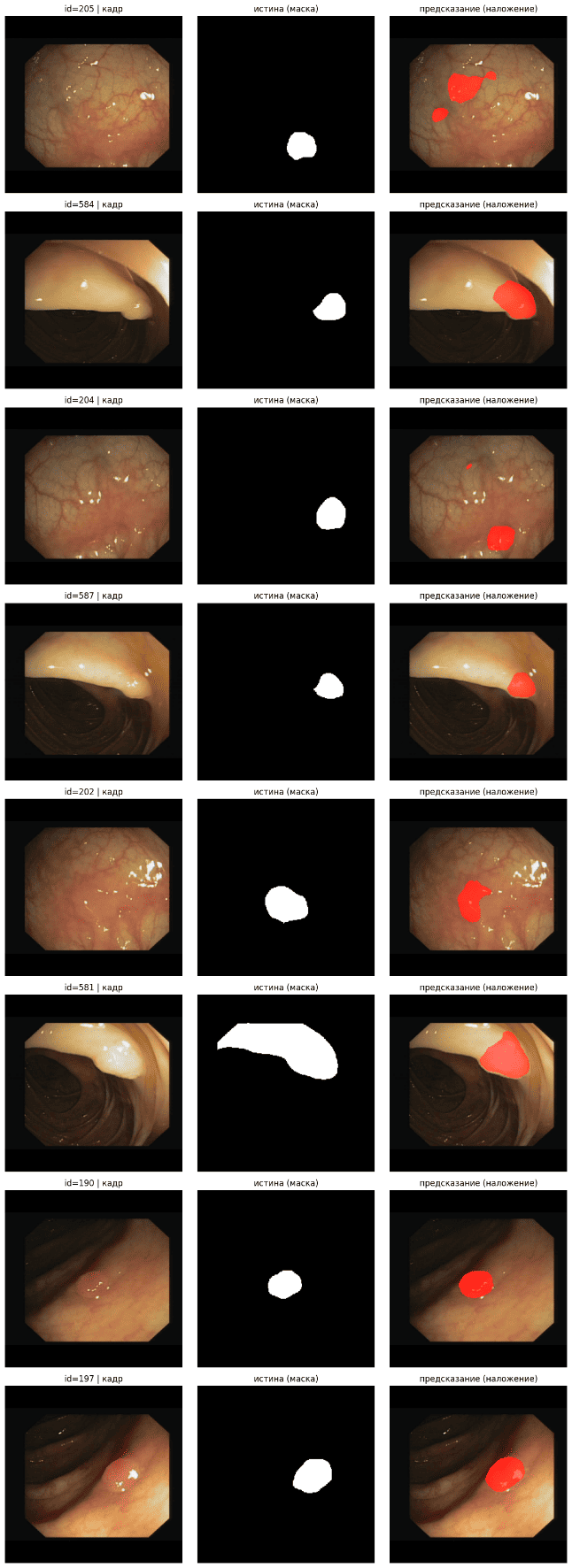 Качественные примеры предсказаний (см. рис. 4) демонстрируют два повторяющихся сценария улучшения: «достраивание» тонких участков полипа по краю и снижение разрывов внутри маски, что согласуется с эффектом границе-ориентированной регуляризации (Kervadec et al., 2021; Karimi, Salcudean, 2019). Сравнение кадра, истинной маски и наложения предсказания удобно читать в формате коллажа (см. рис. 5), поскольку геометрия объекта важнее абсолютных чисел на одном кадре. Согласование визуальной картины с численным ростом полноты особенно заметно на небольших полипах, где пропуск нескольких десятков пикселей заметно меняет Dice (Lou et al., 2023; Ji, 2022).