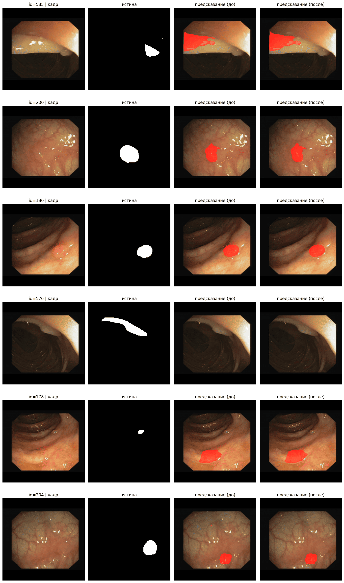 Постобработка через выбор крупнейшей связной компоненты дала наглядный выигрыш в ситуациях, где модель производит несколько разрозненных «островков» на фоне текстур слизистой (см. рис. 6). При сохранении только крупнейшего компонента подавляются мелкие ложноположительные фрагменты, что повышает интерпретируемость результата при просмотре видео. Наблюдаемая разница «до/после» особенно полезна при низких порогах бинаризации, когда вероятность-маска становится более «шумной» (Ji, 2022; A Survey on Deep Learning…, 2023).