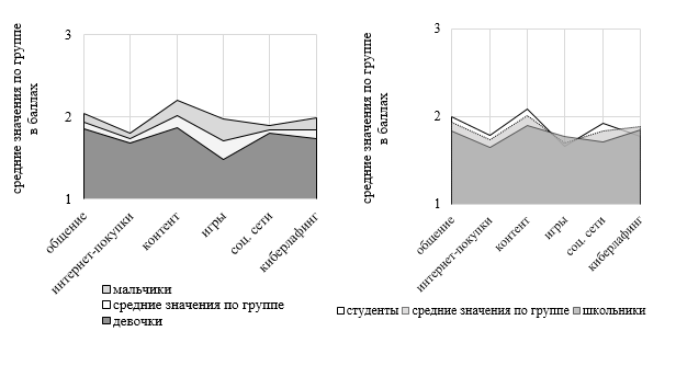 У студентов преобладающими являются такие виды киберлафинга, как общение, использование контента и социальных сетей. Реже всего среди них встречается игровой киберлафинг. У школьников к наиболее часто встречающимся видам киберлафинга относятся общение и использование интернет-контента. Менее всего на уроках они склонны использовать социальные сети и играть. Согласно Н-критерию между школьниками и студентами существуют различия в уровне киберлафинга (Н=9,36; р=0,002).