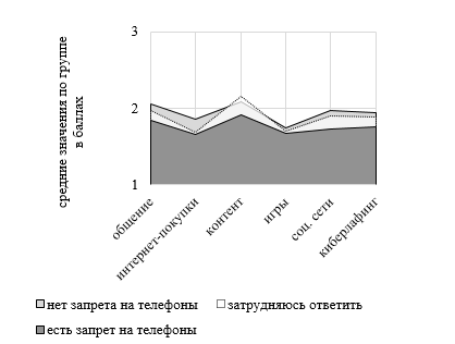 Согласно средним значениям по группе к киберлафингу участники исследования прибегают редко (M=2). При этом структура киберлафинга имеет свои особенности в зависимости от пола и уровня обучения, а уровень киберлафинга – от наличия в образовательном учреждении запрета на использование телефона.