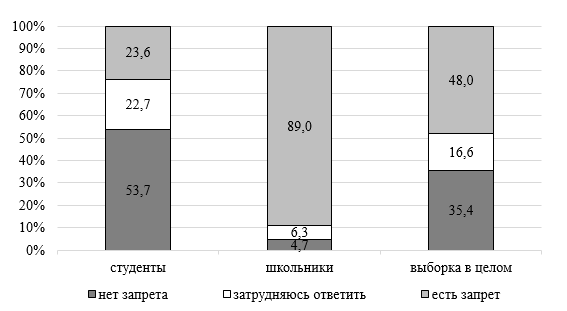 Учащиеся, которые знают о запрете на использование телефонов во время учебных занятий, ожидаемо реже это делают, чем учащиеся, которые о таком запрете не знают или сомневаются в его наличии (Н=10,16; р=0,006). Однако, как показали результаты исследования, независимо от наличия/отсутствия запретительных мер и школьники, и студенты используют телефоны в личных целях на учебных занятиях (рис. 1).