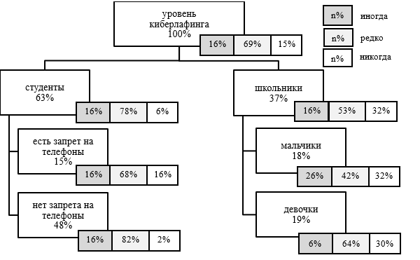 На уровень киберлафинга в первую очередь оказывает влияние ступень образования. Доля школьников, которые никогда не используют телефон на уроке, выше среди школьников (32%), чем среди студентов (6%). Различия достоверны при р≤0,0001 (χ2эмп=42,48; ст.св.=2). Для школьников фактором второго порядка, влияющим на уровень киберлафинга, оказался пол: среди мальчиков доля, использующих телефон на учебных занятиях в личных целях, оказалась выше (26%), чем среди девочек (6%). Различия достоверны при р≤0,01 (χ2эмп=10,85; ст.св.=2). Для студентов фактором второго порядка, влияющим на уровень киберлафинга, оказался запрет на использование телефона в учебном заведении: среди студентов, для которых такого запрета нет, доля учащихся, не использующих смартфон на занятии в личных целях, оказалась самой маленькой (по сравнению с другими сегментами выборки) – 2%. Среди студентов, которые знают о запрете на использование телефона на учебных занятиях, доля аналогичных лиц составила 16% (χ2эмп=42,48; ст.св.=2; р≤0,01).